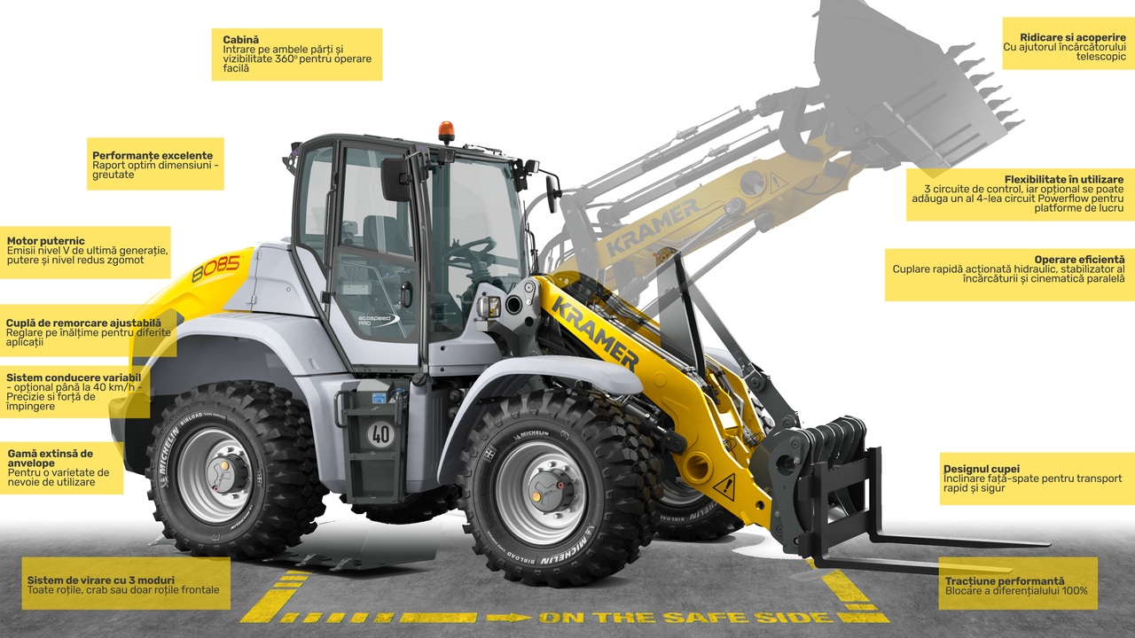 Rezistent ca design și construit inteligent în interior, încărcătorul frontal Kramer beneficiază de multiple caracteristici care asigură diferențierea prin trei trăsături majore: putere, siguranță și confort.