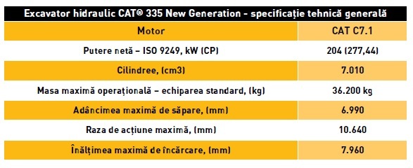 Potrivit producătorului, noul excavator model 335 oferă, pentru o manevrabilitate sporită, cea mai strânsă rază de rotire a consolei spate din clasa sa, astfel încât el se dovedește ideal pentru operarea în șantiere cu spațiu de lucru restricționat, ca de exemplu, excavarea în aproprierea clădirilor sau proiectele rutiere cu închideri ale benzii de circulație. Bine cunoscut în întreaga lume pentru funcționarea sa fiabilă, motorul Cat C7.1, instalat și pe modelul 335, îndeplinește cele mai stricte standarde de emisii de gaze poluante grație unui sistem de post-tratare a gazelor de evacuare fără întreținere.