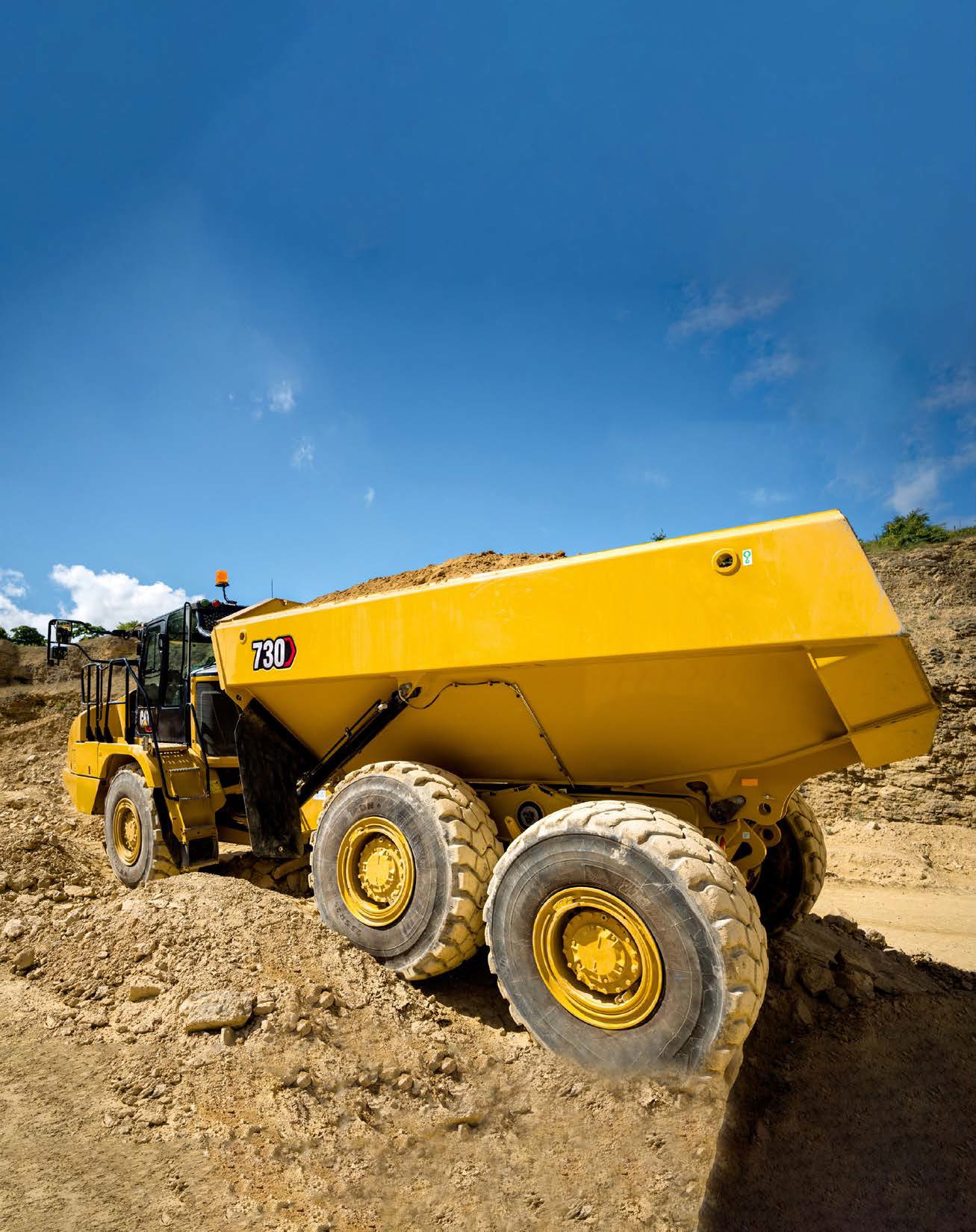 Modelul Cat 730 EJ (Ejector) oferă o soluție unică de descărcarea încărcăturii fără ridicarea benei, contribuind astfel la menținerea stabilității vehiculului. Acest sistem unic este ideal pentru terenuri înclinate, terenuri foarte moi sau în spații cu înălțime limitată – cum sunt cele din jurul liniilor electrice aeriene, rampele depozitelor de deșeuri sau tunelurile. Cu această soluție, multifuncționala autobasculantă articulată 730 EJ oferă timpi de ciclu de lucru mai rapizi, putând descărca și împrăștia uniform materialul din benă în timpul deplasării, reducând astfel necesitatea echipamentelor suplimentare de împrăștiere și nivelare.