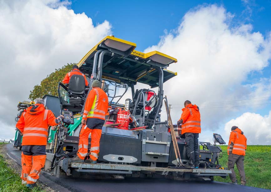 - Așternerea stratului de uzură din asfalt nou a fost realizată, de asemenea, cu finisorul Vögele Super 2100-5i, care a fost alimentat de un alimentator Vögele MT 3000-2i.