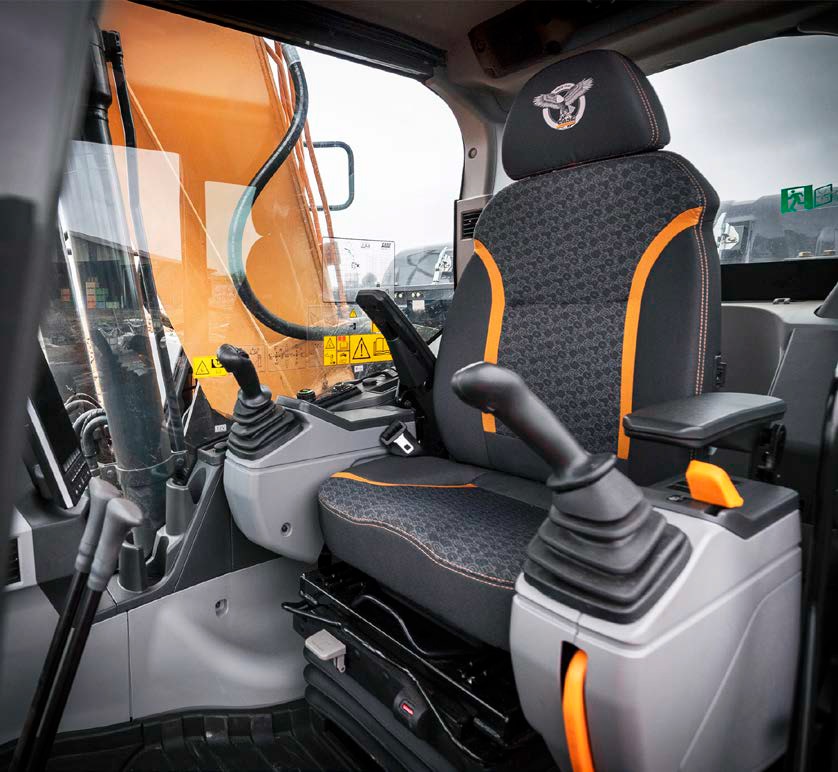 Monitorul de 10 inch, cu rezoluție ridicată, centralizează comenzile și informațiile esențiale, iar comenzile pot fi personalizate în funcție de stilul de lucru. Scaunul ergonomic cu reglaje multiple, suspensia pneumatică și poziționarea optimizată a joystickurilor reduc oboseala în turele lungi, un aspect esențial pentru productivitatea zilnică.