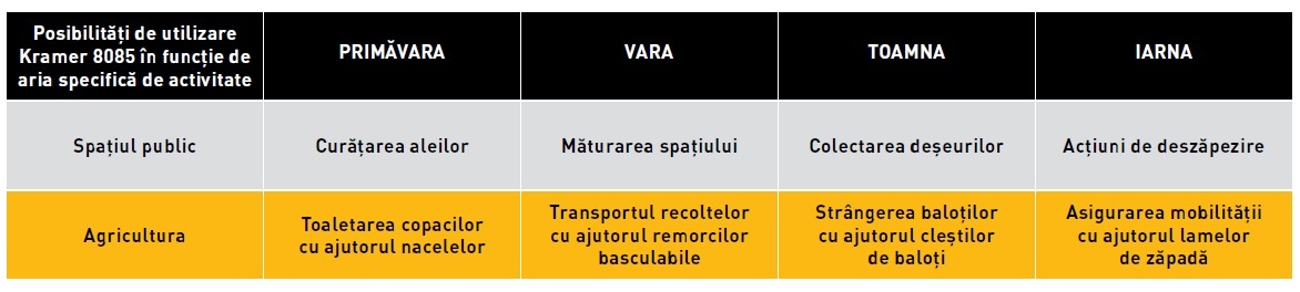 În funcție de provocările pe care le aveți în vedere, specialiștii Grădinariu vă pot consilia să faceți selecția potrivită de accesorii pentru încărcătorul multifuncțional Kramer. Datorită sistemului de prindere hidraulic, adaptarea încărcătorului Kramer se poate face în doar câteva minute, fără a necesita personal autorizat. În acest fel, gama compactă a încărcătoarelor Kramer - al cărei model de vârf este 8085 - include adevărate echipamente multifuncționale utilizabile pe durata întregului an, atât pentru întreținerea spatiului public sau privat, cât și în agricultură sau construcții.