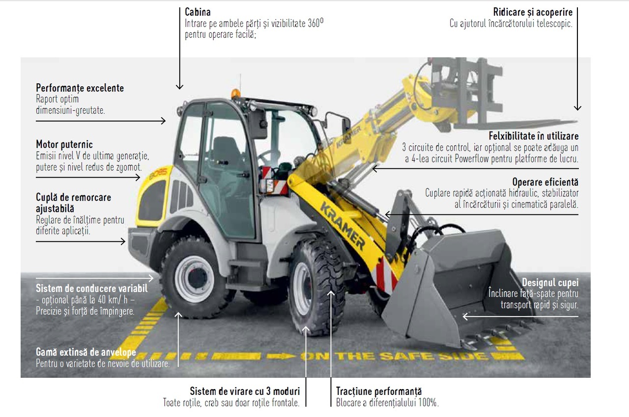 Încărcătorul frontal din seria 8 premium Kramer stabilește noi standarde în termeni de tehnologie, putere și confort. Sistemul de operare eficient și diferențialul 100% convertibil permite putere maximă de împingere și cea mai bună tracțiune pentru o gamă largă de aplicații. Șasiul unitar asigură, de asemenea, o stabilitate maximă și operabilitate excelentă, alături de volumul cupei de încărcare de 0.85 - 1.5m³ (în funcție de densitatea materialelor).