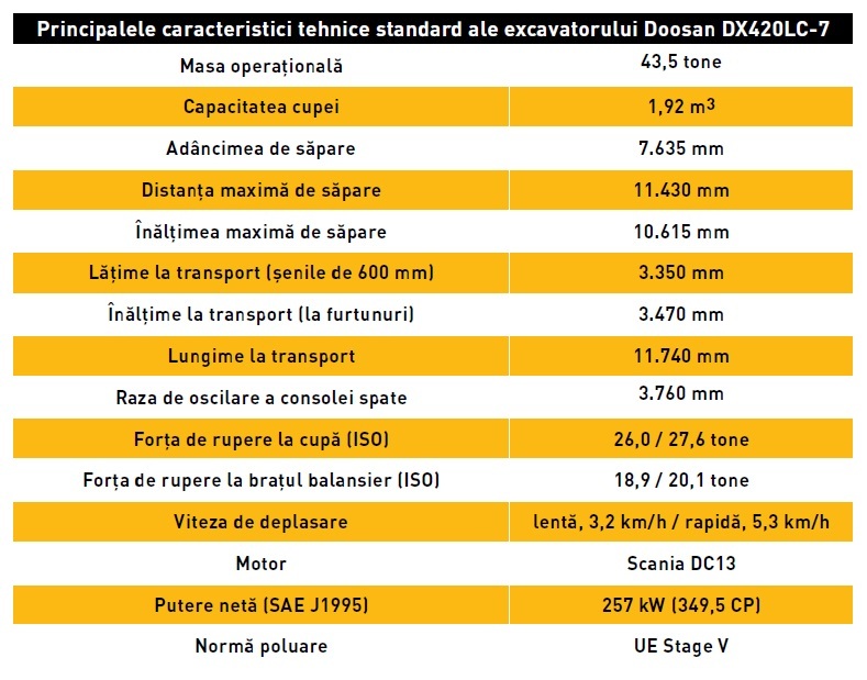 Noul excavator cu șenile Doosan DX420LC-7 Stage V, lansat în premieră pe piață la sfârșitul verii de Doosan Infr acore Europe, se dovedește, conform caracteristicilor prezentate de producător, excavatorul cel mai productiv și cel mai eficient din punct de vedere al consumului din clasa de greutate de 43 tone.